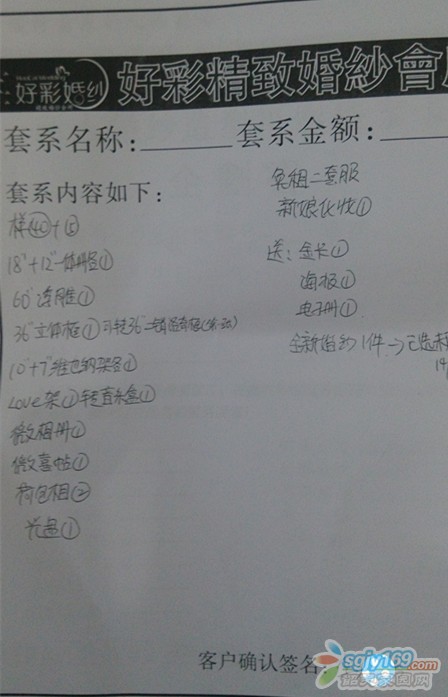 正文摘要:人于8月14號在好彩婚紗攝影約定了一套婚紗照原價(jià)5999元(惠州奧地利小鎮(zhèn)攝影基地3套衣服+仁化好彩專用奧斯卡攝影基地3套衣服)。 和店員協(xié)商后優(yōu)惠價(jià)為5299元,另外贈(zèng)送一套全新婚紗。   ... |